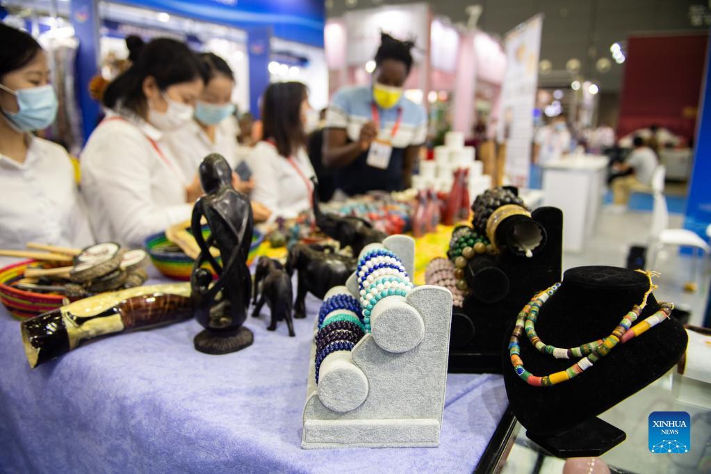 Visitors select ornaments during the second China-Africa Economic and Trade Expo in Changsha, capital of central China's Hunan Province, Sept. 27, 2021. The second China-Africa Economic and Trade Expo opened Sunday in Changsha. The four-day event, online and offline, has attracted nearly 900 enterprises from nearly 40 African countries and China, according to the organizers. (Xinhua/Chen Sihan)