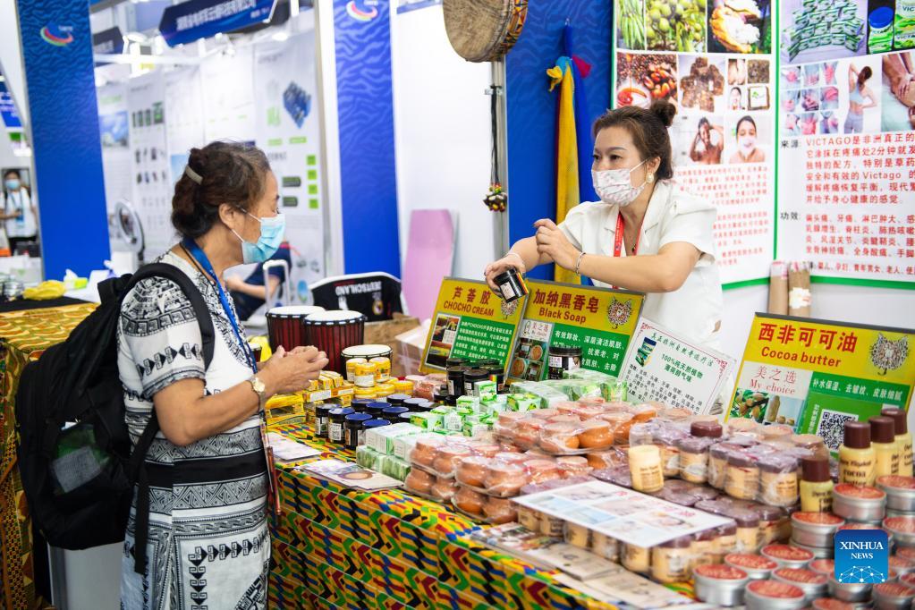 An exhibitor (R) introduces skincare products made in Africa during the second China-Africa Economic and Trade Expo in Changsha, capital of central China's Hunan Province, Sept. 27, 2021. The second China-Africa Economic and Trade Expo opened Sunday in Changsha. The four-day event, online and offline, has attracted nearly 900 enterprises from nearly 40 African countries and China, according to the organizers. (Xinhua/Chen Sihan)