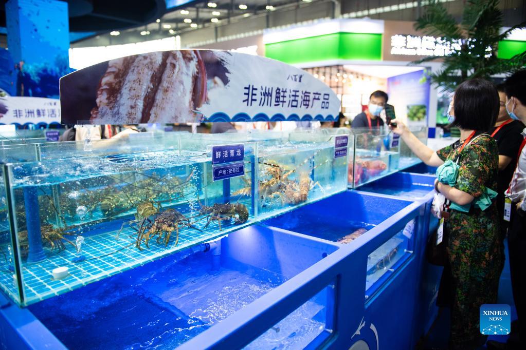 Visitors select aquatic products during the second China-Africa Economic and Trade Expo in Changsha, capital of central China's Hunan Province, Sept. 27, 2021. The second China-Africa Economic and Trade Expo opened Sunday in Changsha. The four-day event, online and offline, has attracted nearly 900 enterprises from nearly 40 African countries and China, according to the organizers. (Xinhua/Chen Sihan)