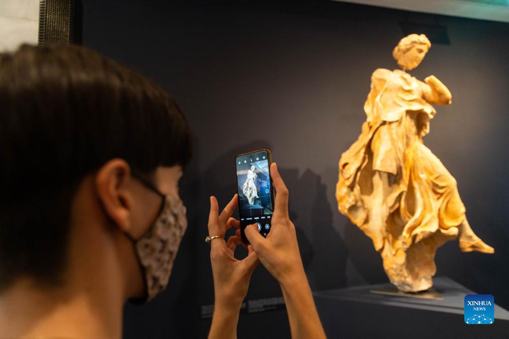A visitor takes pictures of a statue during a preview of the exhibition "Kallos, The Ultimate Beauty" at the Museum of Cycladic Art in Athens, Greece, on Sept. 27, 2021. A new exhibition by the Museum of Cycladic Art in Athens invites visitors to reflect on their personal notion of ultimate beauty by taking them on a time-travel in ancient Greece. Through 300 antiquities gathered from 52 museums, Ephorates of Antiquities and collections in Greece, Italy and the Vatican, the exhibition entitled "Kallos, The Ultimate Beauty," presents what this concept meant in everyday life and the philosophical discourse in ancient Greece, the organizers told a press conference on Monday. (Xinhua/Marios Lolos)