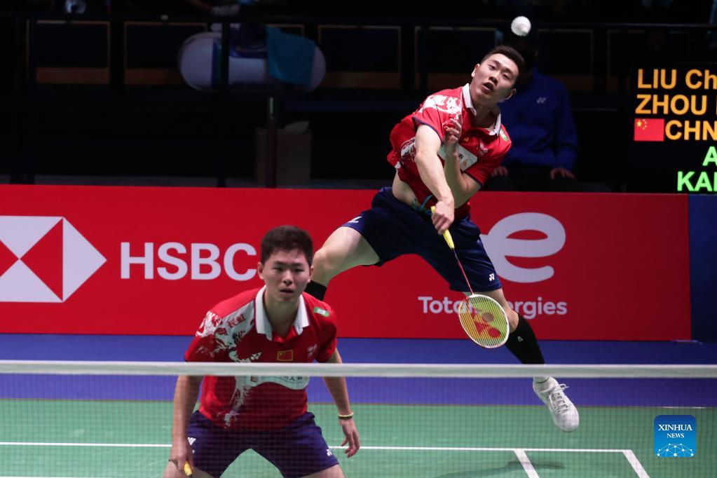China's Zhou Haodong (L)/Liu Cheng compete against India's M.R. Arjun/Dhruv Kapila in the men's doubles competition during the group A match between China and India at Badminton Surdiman Cup 2021 in Vantaa, Finland, Sept. 27, 2021. (Photo by Matti Matikainen/Xinhua)