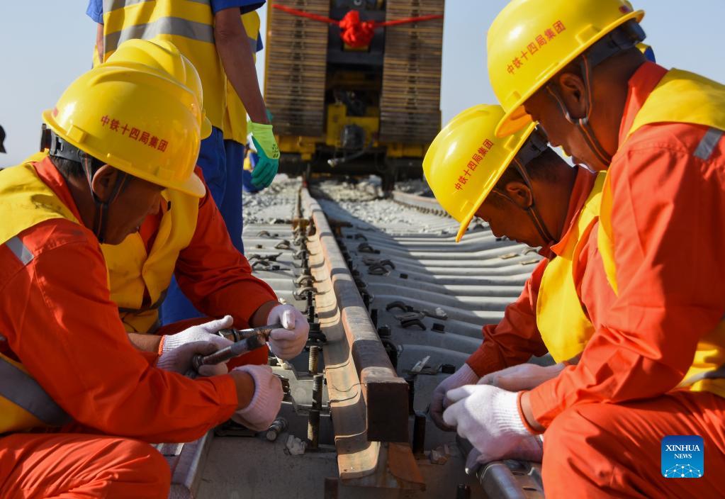 Workers tighten the screw of the rail for the Hotan-Ruoqiang Railway in northwest China's Xinjiang Uygur Autonomous Region, Sept. 27, 2021. The track-laying work for the Hotan-Ruoqiang Railway, the final section of the Taklimakan Desert railway loop line, was completed on Monday morning in Xinjiang's Minfeng County. Construction on the Hotan-Ruoqiang Railway started in December 2018. As a key national railway project extending over 825 km, it links up Hotan City in Hotan Prefecture with Ruoqiang County in Bayingolin Mongolian Autonomous Prefecture. The Hotan-Ruoqiang Railway is expected to open in June 2022. (Xinhua/Gu Yu)