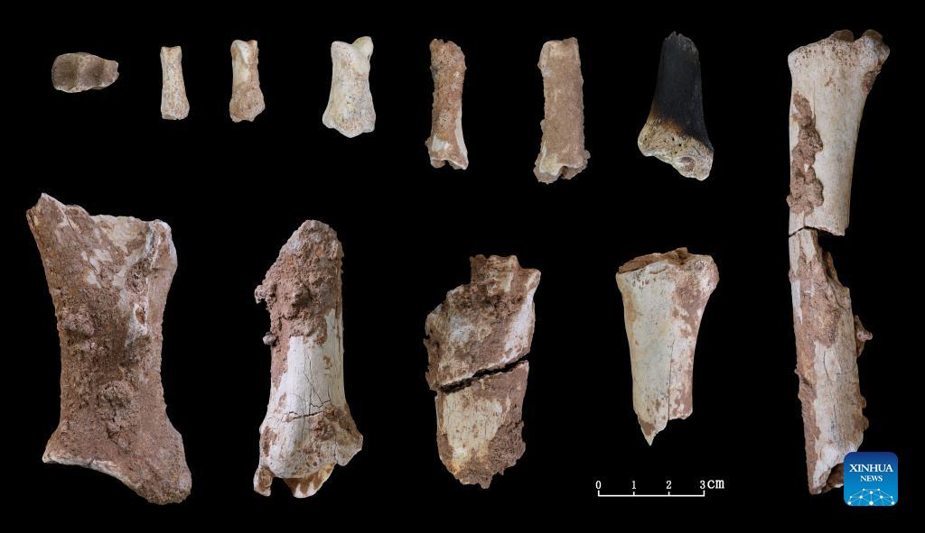 Photo shows animal fossils unearthed from a cave site in Lushan County, central China's Henan Province. A human skull fossil dating back 32,000 years was found in a cave site in Henan, local archaeological authorities said on Sept. 27, 2021. The cave site is located in Guanyinsi Township, Lushan County. Earlier paleolithic archaeological research in the area has uncovered human fossils, animal fossils and stone tools. (Henan Provincial Institute of Cultural Heritage and Archaeology/Handout via Xinhua)
