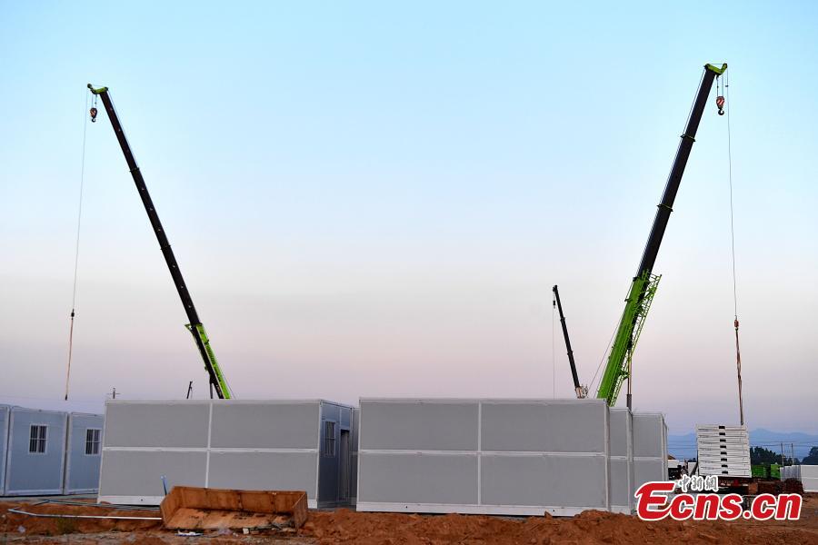 An isolation center with 1,000 temporary quarantine rooms is under construction on a 24/7 basis at Ruifeng Industrial Park in Xianyou County, Putian City, east China’s Fujian Province, Sept. 27, 2021. (China News Service/Zhang Bin)