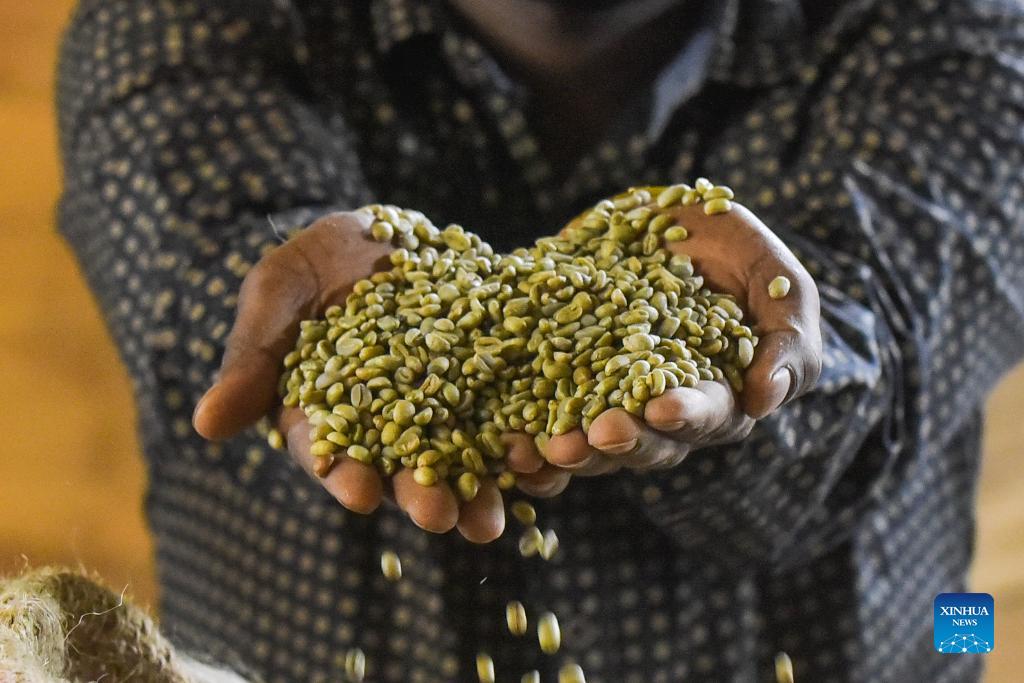 A worker presents coffee beans at a coffee farm in Gomma of Oromia, Ethiopia, on Sept. 22, 2021. Ethiopia, known as the origin of Arabica coffee, is recognized worldwide for its rich coffee quality and flavor, which ranges from winy to fruity and chocolate, making the country's coffee varieties on demand across the globe. The growing popularity of Ethiopian coffee in China reflects the huge potential of African products in Chinese market. (Photo by Michael Tewelde/Xinhua)