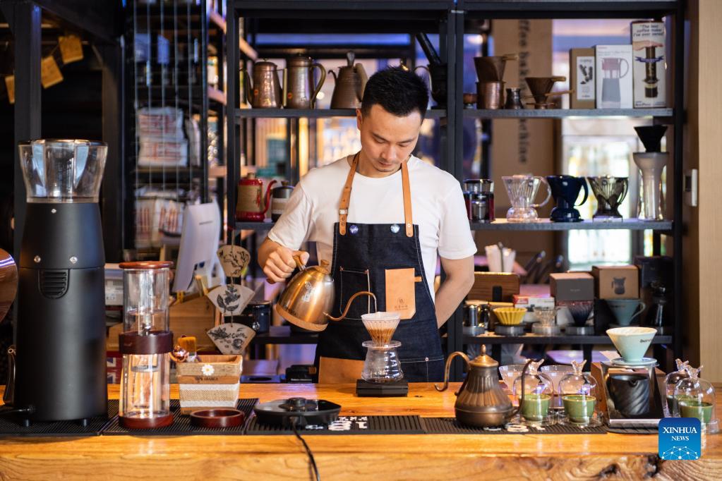 A barista makes coffee at an African coffee shop in Changsha, central China's Hunan Province, on Sept. 24, 2021. Ethiopia, known as the origin of Arabica coffee, is recognized worldwide for its rich coffee quality and flavor, which ranges from winy to fruity and chocolate, making the country's coffee varieties on demand across the globe. The growing popularity of Ethiopian coffee in China reflects the huge potential of African products in Chinese market. (Xinhua/Chen Sihan)