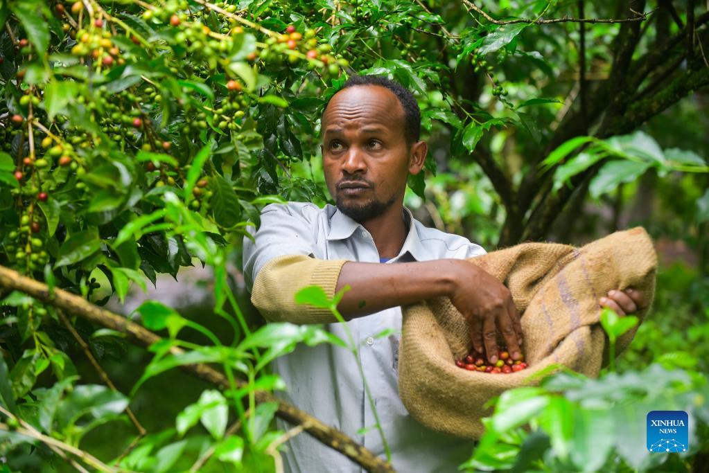 A coffee farmer picks coffee beans at a coffee farm in Gomma of Oromia, Ethiopia, on Sept. 22, 2021. Ethiopia, known as the origin of Arabica coffee, is recognized worldwide for its rich coffee quality and flavor, which ranges from winy to fruity and chocolate, making the country's coffee varieties on demand across the globe. The growing popularity of Ethiopian coffee in China reflects the huge potential of African products in Chinese market. (Photo by Michael Tewelde/Xinhua)