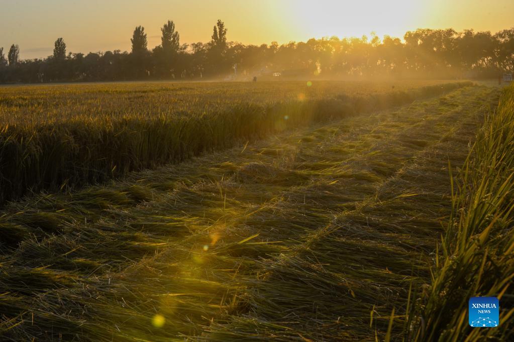 Photo taken on Sept. 26, 2021 shows the harvested rice straws in Kekedala City, northwest China's Xinjiang Uygur Autonomous Region. (Xinhua/Gao Han)