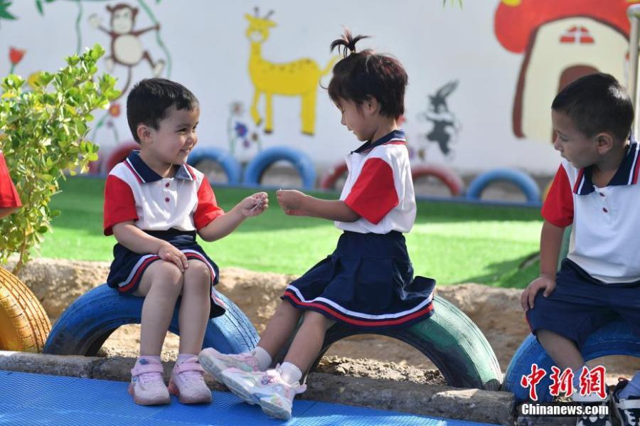 Children play games on the playground in Kumu village's kindergarten, Hotan County, China's Xinjiang Uygur Autonomous Region, Sept. 27, 2021. (China News Service/Tian Yuhao)