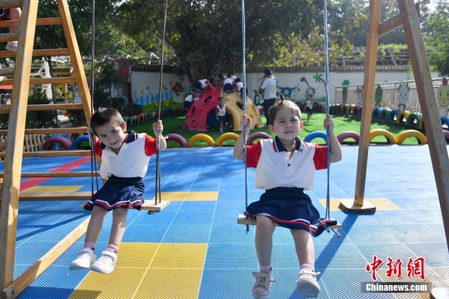 Children swing on the playground in Kumu village's kindergarten, Hotan County, China's Xinjiang Uygur Autonomous Region, Sept. 27, 2021. (China News Service/Tian Yuhao)