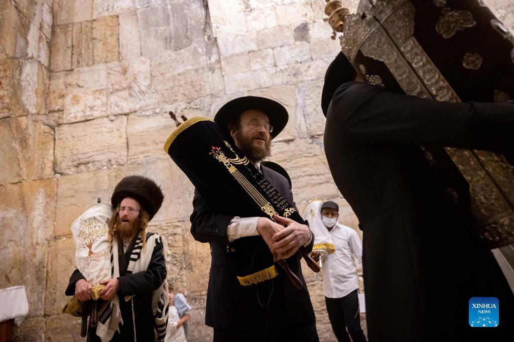 Jewish men carry Torah scrolls during Simchat Torah celebrations at the Western Wall in Jerusalem's Old City, on Sept. 28, 2021. (JINI via Xinhua)