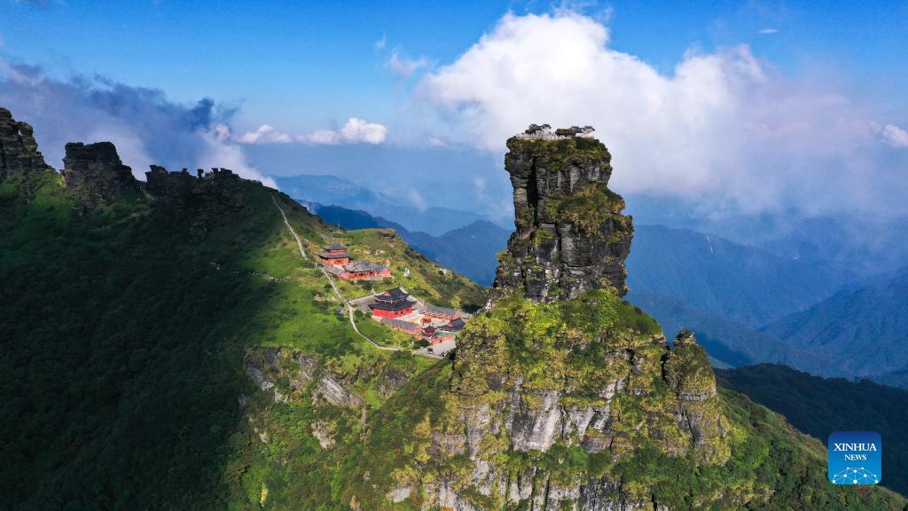 Aerial photo taken on Sept. 27, 2021 shows a view of Mount Fanjing in Tongren City, southwest China's Guizhou Province. Boasting rich natural resources and high vegetation coverage, Mount Fanjing was listed as a UNESCO World Natural Heritage Site in 2018. (Xinhua/Yang Wenbin)