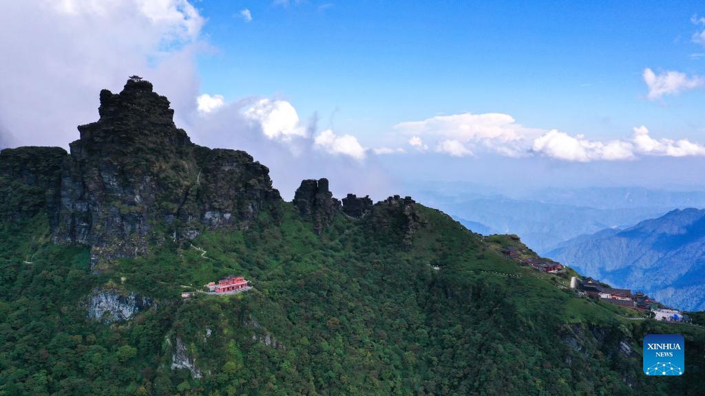 Aerial photo taken on Sept. 27, 2021 shows a view of Mount Fanjing in Tongren City, southwest China's Guizhou Province. Boasting rich natural resources and high vegetation coverage, Mount Fanjing was listed as a UNESCO World Natural Heritage Site in 2018. (Xinhua/Yang Wenbin)