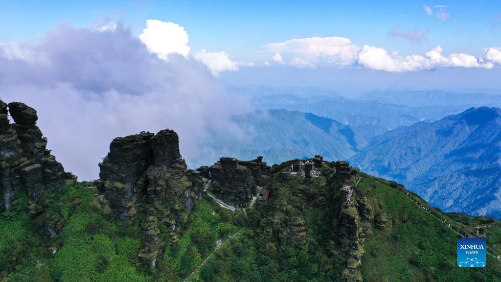 Aerial photo taken on Sept. 27, 2021 shows a view of Mount Fanjing in Tongren City, southwest China's Guizhou Province. Boasting rich natural resources and high vegetation coverage, Mount Fanjing was listed as a UNESCO World Natural Heritage Site in 2018. (Xinhua/Yang Wenbin)
