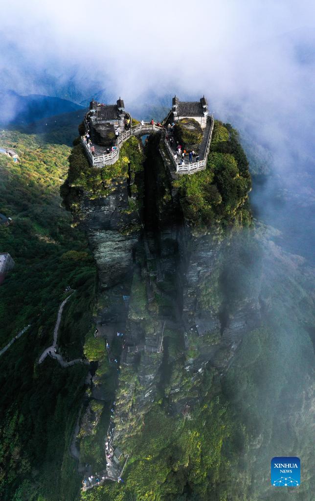Aerial photo taken on Sept. 27, 2021 shows a view of Mount Fanjing in Tongren City, southwest China's Guizhou Province. Boasting rich natural resources and high vegetation coverage, Mount Fanjing was listed as a UNESCO World Natural Heritage Site in 2018. (Xinhua/Yang Wenbin)