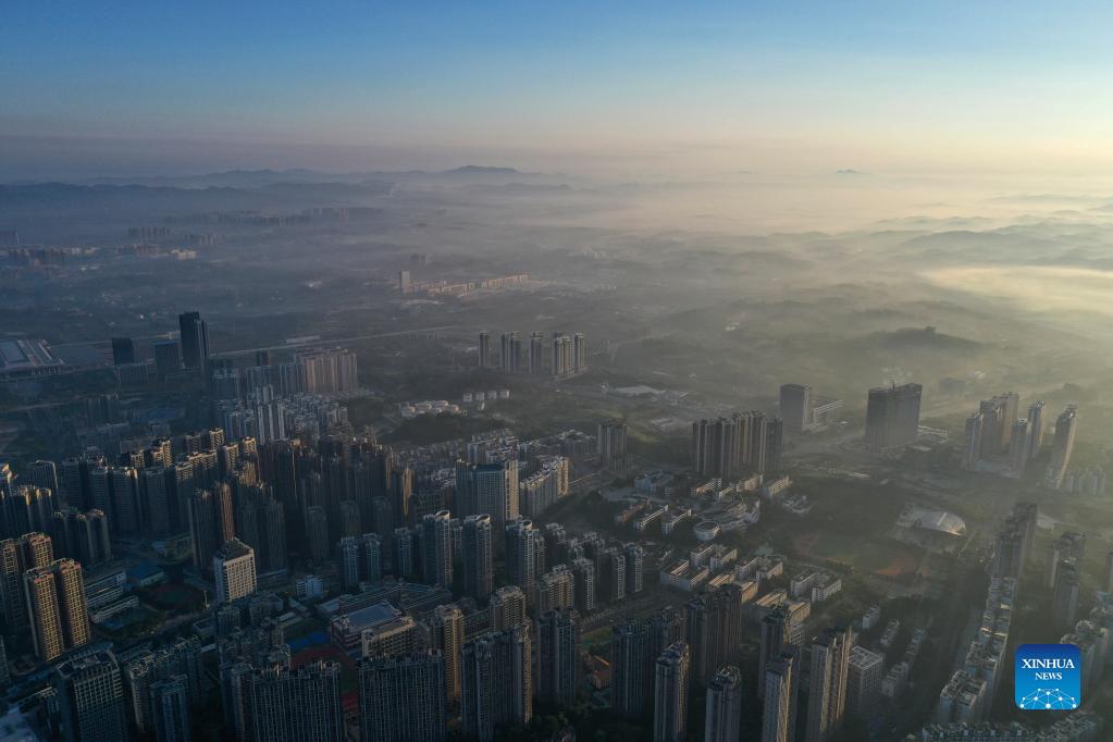 Aerial photo taken on Sept. 27, 2021 shows an early morning view of Nanning, capital of south China's Guangxi Zhuang Autonomous Region. (Xinhua/Huang Xiaobang)