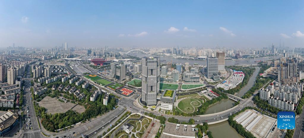 Aerial panorama photo taken on Sept. 28, 2021 shows headquarters building of the New Development Bank (NDB) and its neighborhood in Shanghai, east China. A handover &move-in ceremony of the NDB headquarters building was held on Tuesday. (Xinhua/Fang Zhe)