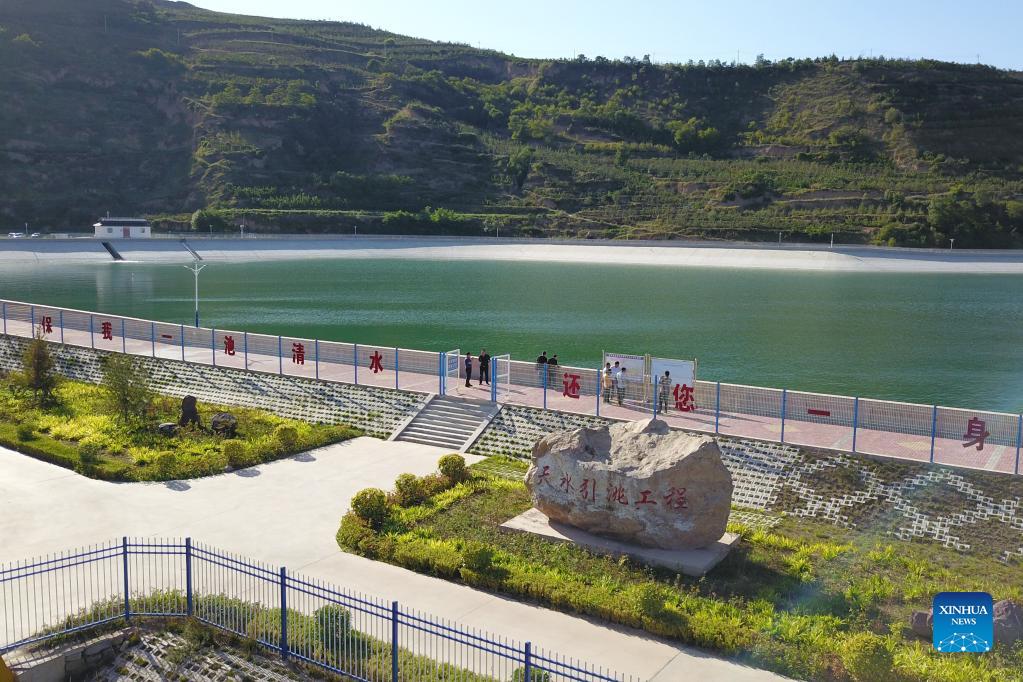 Aerial photo taken on Sept. 8, 2021 shows a reservoir for a water diversion project designed to deliver water from the Taohe River, a major tributary of the Yellow River, to areas suffering severe water shortages in the central part of Gansu, in Tianshui, northwest China's Gansu Province. A major water diversion project in Gansu has been completed as the second phase of the project began supplying water Tuesday. The project is expected to alleviate water shortages for more than six million people in the province, local authorities said Tuesday. (Xinhua/Fan Peishen)