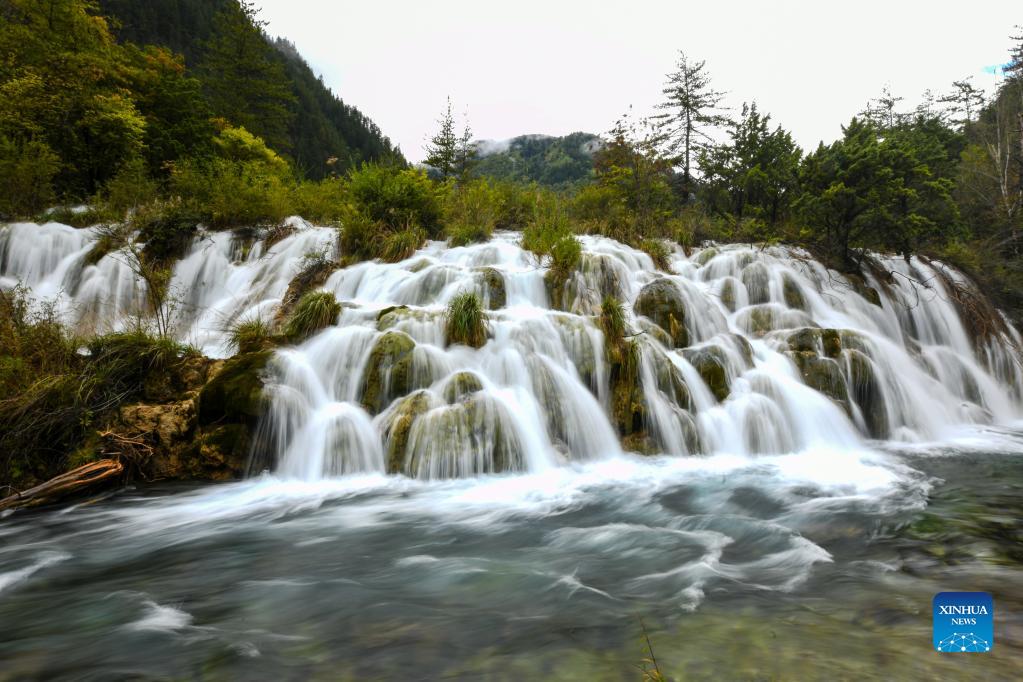 Photo taken on Sept. 27, 2021 shows a waterfall at the Jiuzhaigou scenic spot in Jiuzhaigou County, southwest China's Sichuan Province. Jiuzhaigou, a famous scenic spot in Sichuan Province, fully reopened to visitors on Tuesday. On Aug. 8, 2017, a 7.0-magnitude quake forced the closure of the Jiuzhaigou National Park, a UNESCO World Heritage site famous for its spectacular waterfalls, lush forests, and serene plateau lakes. More than 270,000 trees have been planted over the past three years, and 172 hectares of ecological habitat repaired and restored in Jiuzhaigou. The damaged mountains and vegetation have also rapidly recovered. The ecosystem was effectively restored. (Xinhua/Tang Wenhao)