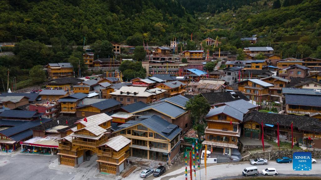 Aerial photo taken on Sept. 27, 2021 shows a view of the Jiuzhaigou scenic spot in Jiuzhaigou County, southwest China's Sichuan Province. Jiuzhaigou, a famous scenic spot in Sichuan Province, fully reopened to visitors on Tuesday. On Aug. 8, 2017, a 7.0-magnitude quake forced the closure of the Jiuzhaigou National Park, a UNESCO World Heritage site famous for its spectacular waterfalls, lush forests, and serene plateau lakes. More than 270,000 trees have been planted over the past three years, and 172 hectares of ecological habitat repaired and restored in Jiuzhaigou. The damaged mountains and vegetation have also rapidly recovered. The ecosystem was effectively restored. (Xinhua/Tang Wenhao)