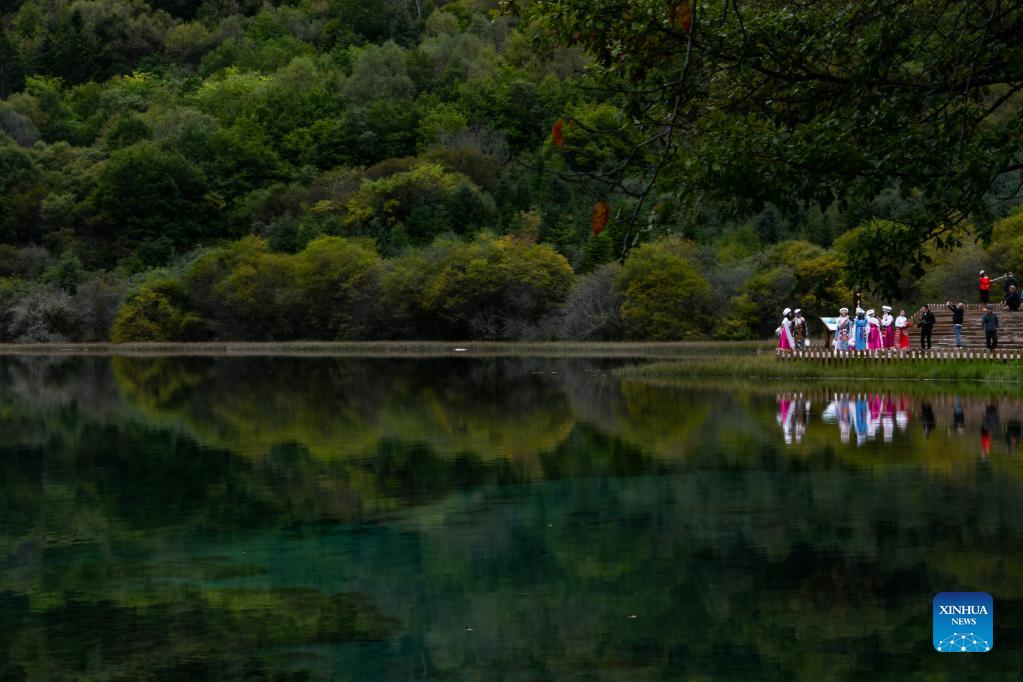 Tourists take photos at the Jiuzhaigou scenic spot in Jiuzhaigou County, southwest China's Sichuan Province, Sept. 27, 2021. Jiuzhaigou, a famous scenic spot in Sichuan Province, fully reopened to visitors on Tuesday. On Aug. 8, 2017, a 7.0-magnitude quake forced the closure of the Jiuzhaigou National Park, a UNESCO World Heritage site famous for its spectacular waterfalls, lush forests, and serene plateau lakes. More than 270,000 trees have been planted over the past three years, and 172 hectares of ecological habitat repaired and restored in Jiuzhaigou. The damaged mountains and vegetation have also rapidly recovered. The ecosystem was effectively restored. (Xinhua/Tang Wenhao)