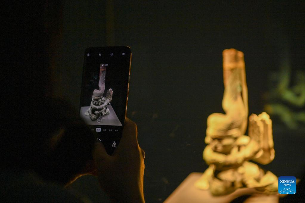 A visitor takes photos of an exhibit excavated from the Sanxingdui Ruins at an exhibition featuring Bronze Age civilizations along the Yangtze River at Sichuan Museum in Chengdu, southwest China's Sichuan Province, Sept. 28, 2021. (Xinhua/Xu Bingjie)