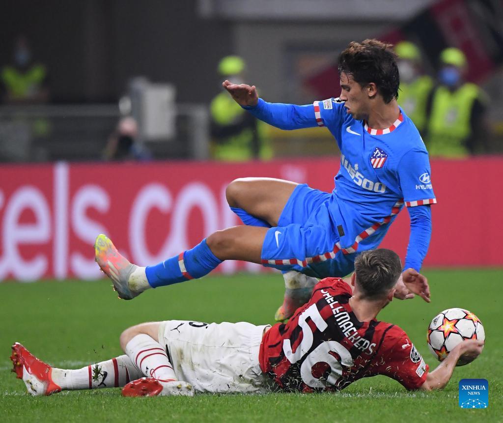 Atletico de Madrid's Joao Felix (back) vies with AC Milan's Alexis Saelemaekers during the UEFA Champions League Group B match between AC Milan and Atletico de Madrid in Milan, Italy, Sept. 28, 2021. (Photo by Alberto Lingria/Xinhua)