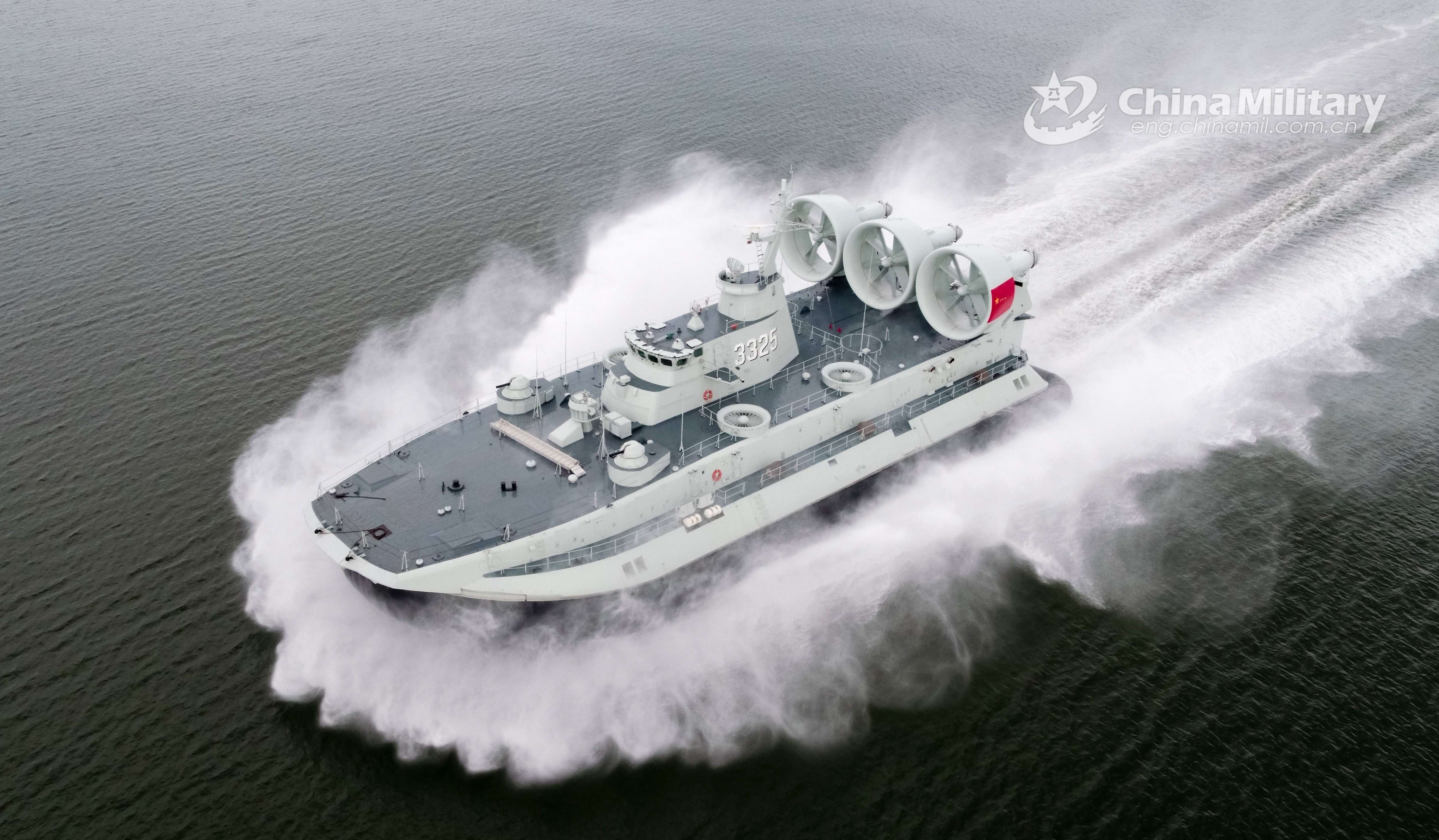 An air-cushioned landing craft attached to a naval landing ship flotilla under the PLA Southern Theater Command maneuvers at high speed during a realistic combat training exercise on September 16, 2021. (eng.chinamil.com.cn/Photo by Li Jia)