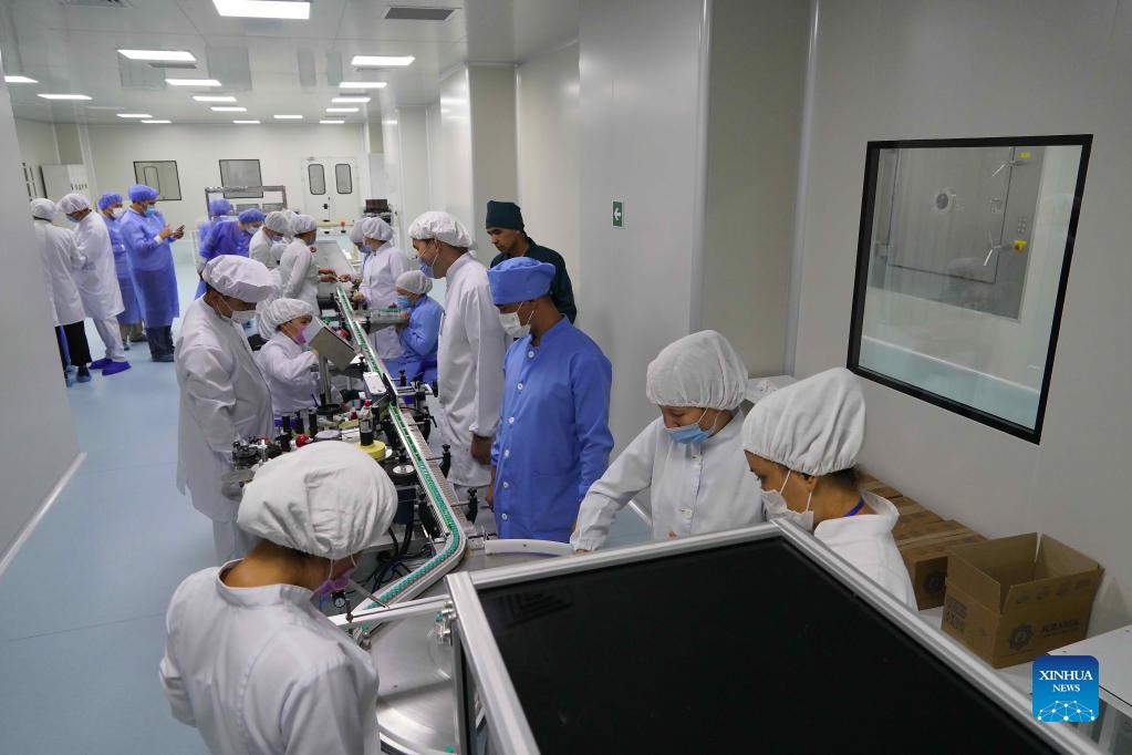 Staff members work on a production line of COVID-19 vaccine at Uzbek pharma Jurabek Laboratories in Uzbekistan, on Sept. 5, 2021. A production line of ZF-UZ-VAC2001 vaccine, jointly developed by the Institute of Microbiology of the Chinese Academy of Sciences and China's Anhui Zhifei Longcom Biopharmaceutical Co., Ltd, has been put into production recently at Uzbek pharma Jurabek Laboratories. Earlier, Jurabek Laboratories has agreed with Anhui Zhifei Longcom Biopharmaceutical on the local production of the ZF-UZ-VAC2001 vaccine, according to a decree signed by Uzbek Prime Minister Abdulla Aripov. (Photo by Zafar Khalilov/Xinhua)