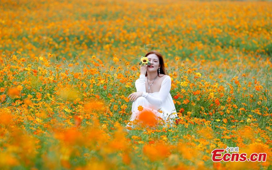 Tourists immerse themselves into a 14-hectare field of orange and yellow cosmos flowers(cosmos sulphureus) in the Optics Valley Ecological Corridor in Wuhan, capital of central China's Hubei Province, Sept. 29, 2021. (China News Service/Zhang Chang)