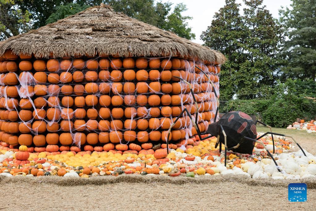 Photo taken on Sept. 28, 2021 shows a pumpkin house at Arboretum's Pumpkin Village in Dallas, Texas, the United States. The Pumpkin Village returns to Dallas Arboretum with more than 90,000 pumpkins, gourds and squash. This year's theme is "Bugtopia". (Photo by Tian Dan/Xinhua)