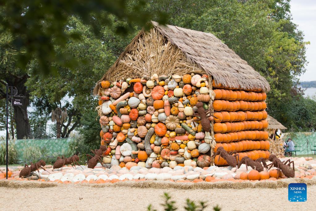 Photo taken on Sept. 28, 2021 shows a pumpkin house at Arboretum's Pumpkin Village in Dallas, Texas, the United States. The Pumpkin Village returns to Dallas Arboretum with more than 90,000 pumpkins, gourds and squash. This year's theme is "Bugtopia". (Photo by Tian Dan/Xinhua)