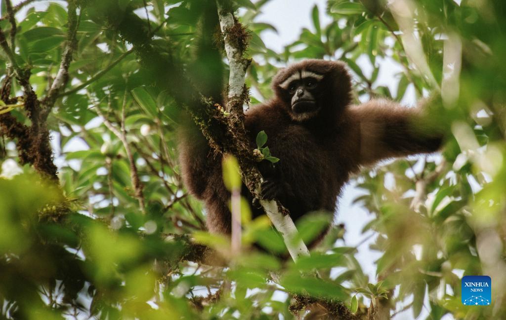 A skywalker gibbon is seen at the Gaoligong Mountain, Baoshan City, southwest China's Yunnan Province, Sept. 28, 2021. Skywalker gibbon, a typical arboreal animal, is one of the national key protected wild animals, mainly found in Gaoligong Mountain. (Xinhua/Wang Guansen)