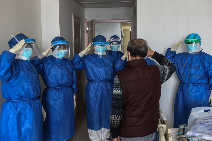 An elderly COVID-19 patient who is about to be discharged from a healthcare center salutes medical workers in Wuhan, central China's Hubei Province, March 14, 2020. (Xinhua/Zhao Jiaqing)