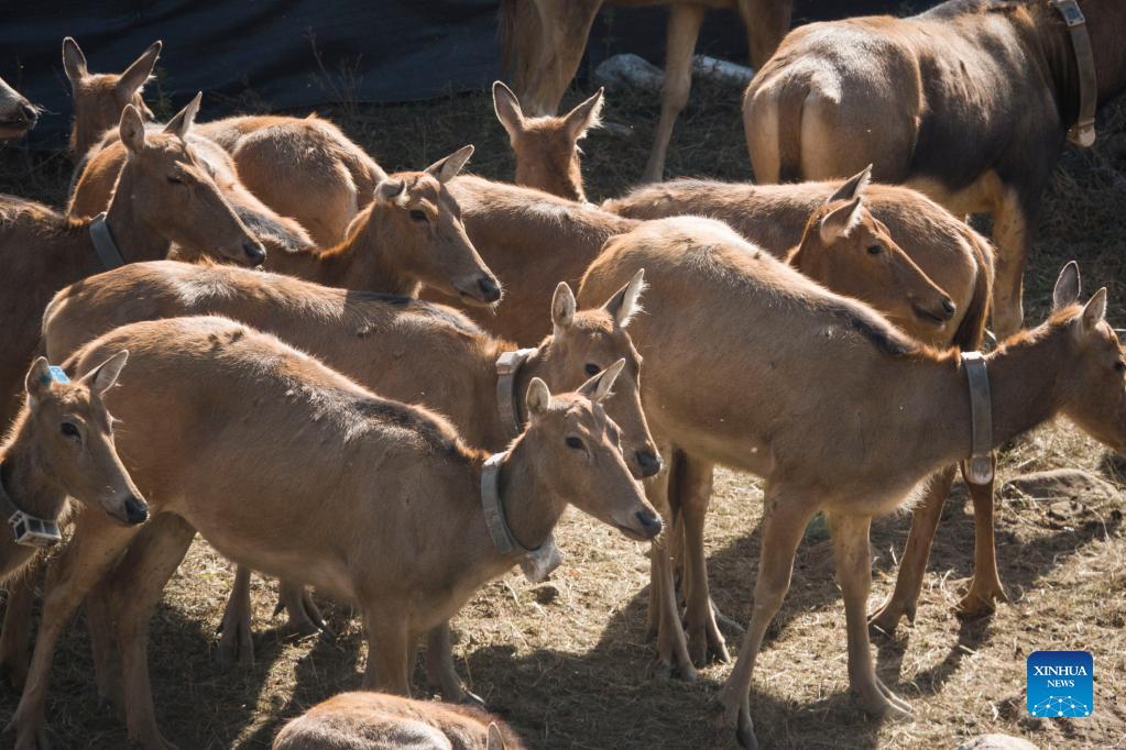 Photo taken on Sept. 29, 2021 shows a herd of elks waiting to be released at the Daqingshan Nature Reserve in Hohhot, north China's Inner Mongolia Autonomous Region. A total of 27 elks (or milu) were released to the Daqingshan Nature Reserve on Wednesday. Those elks will be monitored through tracking necklaces based on the Beidou Navigation Satellite System. (Xinhua/Darhan)