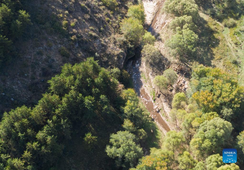 Aerial photo taken on Sept. 29, 2021 shows a herd of elks running at the Daqingshan Nature Reserve in Hohhot, north China's Inner Mongolia Autonomous Region. A total of 27 elks (or milu) were released to the Daqingshan Nature Reserve on Wednesday. Those elks will be monitored through tracking necklaces based on the Beidou Navigation Satellite System. (Xinhua/Darhan)