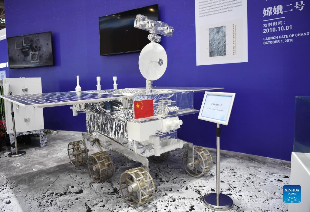 Photo taken on Sept. 29, 2021 shows a model of China's lunar rover on display during the 13th China International Aviation and Aerospace Exhibition, or Airshow China 2021, in Zhuhai, south China's Guangdong Province. (Xinhua/Deng Hua)