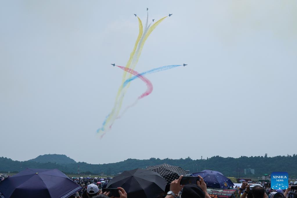J-10 fighter jets of China's Bayi Aerobatic Team perform aerobatics during the 13th China International Aviation and Aerospace Exhibition, or Airshow China 2021, in Zhuhai, south China's Guangdong Province, Sept. 29, 2021. (Xinhua/Liu Dawei)