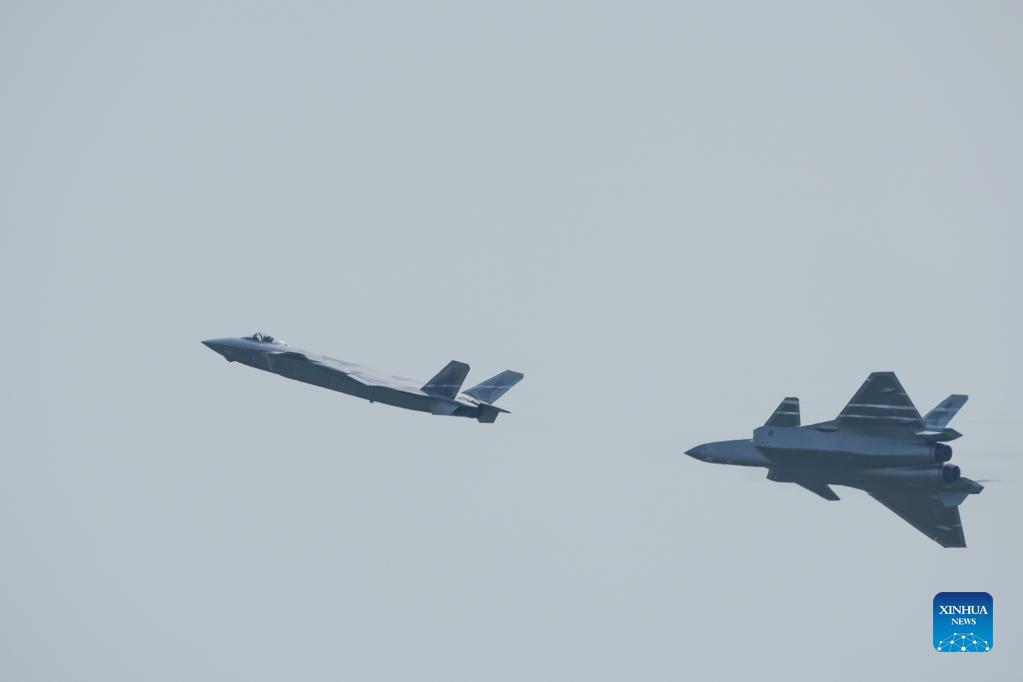 J-20 stealth fighter jets perform aerobatics during the 13th China International Aviation and Aerospace Exhibition, or Airshow China 2021, in Zhuhai, south China's Guangdong Province, Sept. 29, 2021. (Xinhua/Liu Dawei)