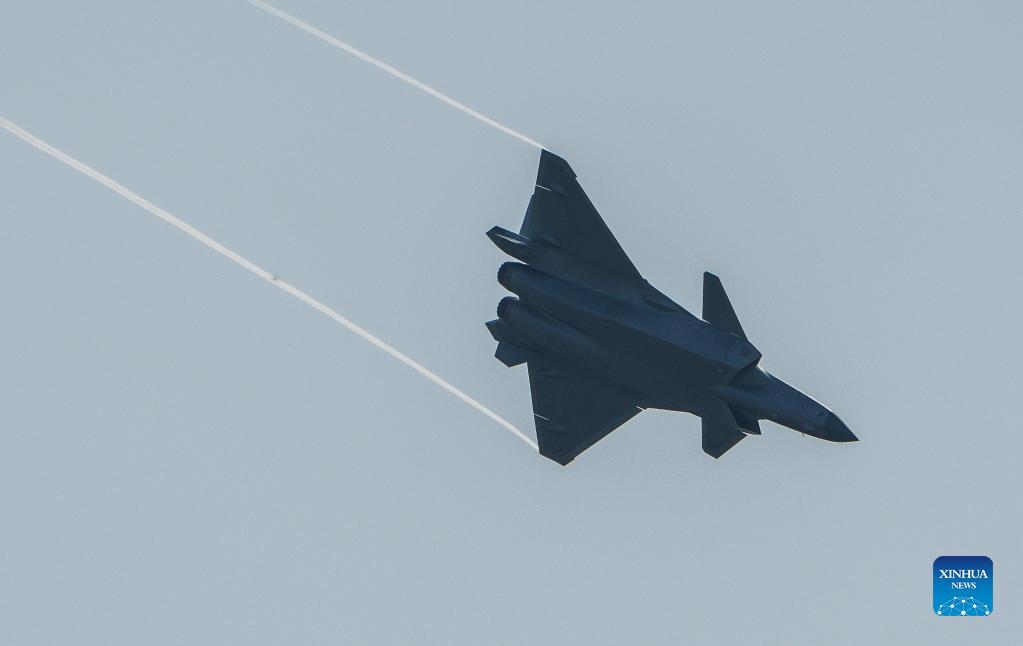 A J-20 stealth fighter jet performs aerobatics during the 13th China International Aviation and Aerospace Exhibition, or Airshow China 2021, in Zhuhai, south China's Guangdong Province, Sept. 29, 2021. (Xinhua/Liu Dawei)