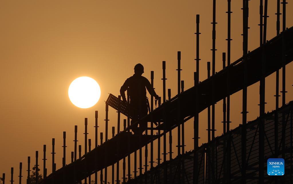 A worker works at a construction site of the 500-KV Xiongdong electricity substation in north China's Hebei Province, Sept. 29, 2021. Xiongdong substation, the first 500-KV substation of Xiongan New Area, is scheduled to be put into operation in 2022, with a total investment of 460 million yuan (about 71.14 million U.S. dollars). (Xinhua/Xing Guangli)