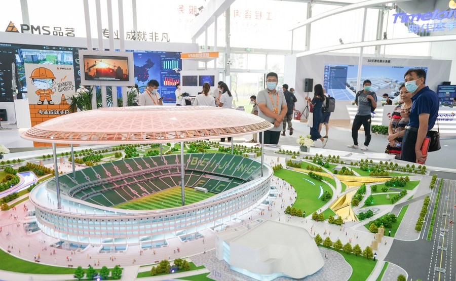 Visitors look at a sand table model of the Workers' Stadium in engineering consulting and construction services exhibition hall during the 2021 China International Fair for Trade in Services (CIFTIS) in Beijing, capital of China, Sept. 4, 2021. (Xinhua/Chen Yehua)