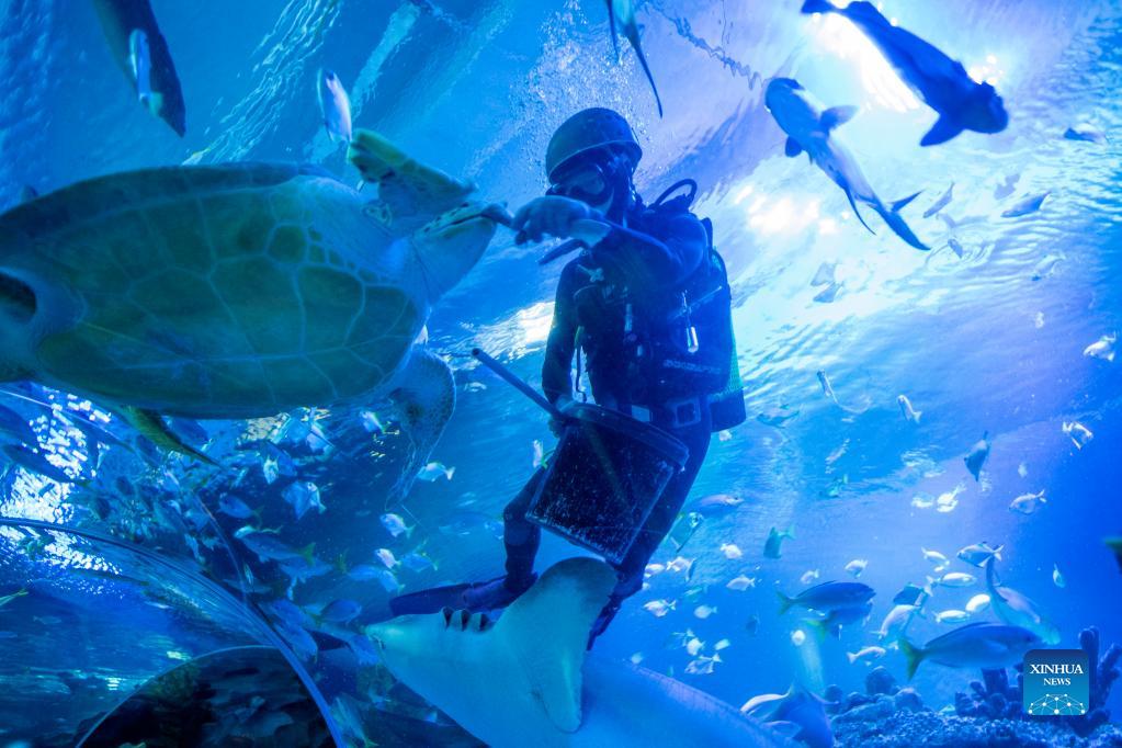 A diver feeds a turtle at Aquaria KLCC in Kuala Lumpur, Malaysia, Sept. 29, 2021. Aquaria KLCC will be open for fully vaccinated visitors starting from Oct. 1. (Photo by Chong Voon Chung/Xinhua)
