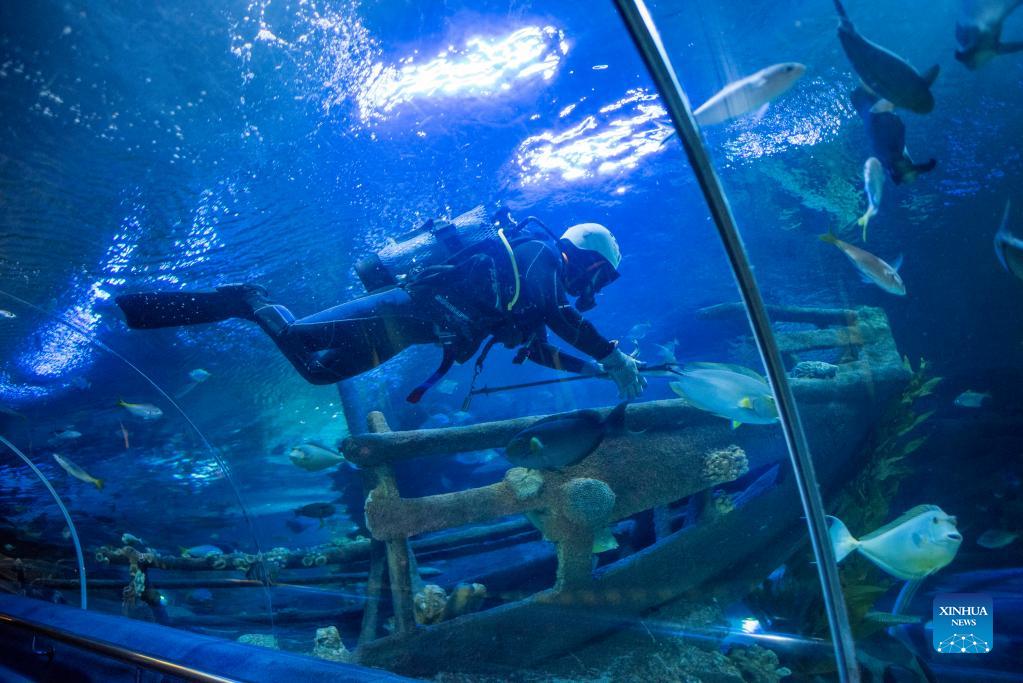 A diver feeds fish at Aquaria KLCC in Kuala Lumpur, Malaysia, Sept. 29, 2021. Aquaria KLCC will be open for fully vaccinated visitors starting from Oct. 1. (Photo by Chong Voon Chung/Xinhua)