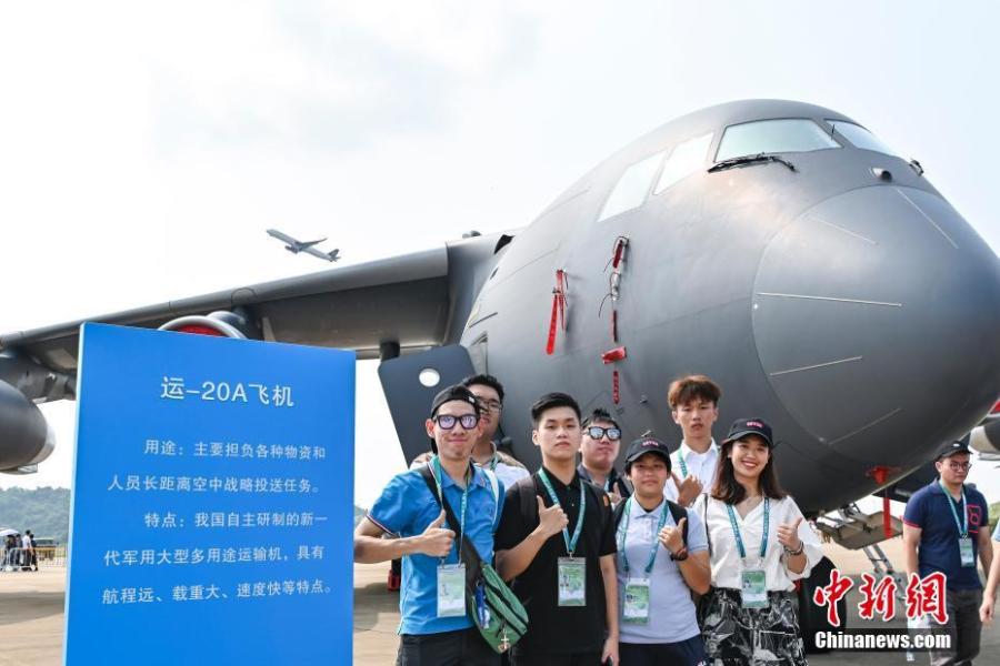 Teenagers from Hong Kong and Macao take a group photo in front of Y-20A transport aircraft during the 13th China International Aviation and Aerospace Exhibition in the southern Chinese city of Zhuhai, Guangdong Province, Sept. 29, 2021. (China News Service/Chen Jimin)