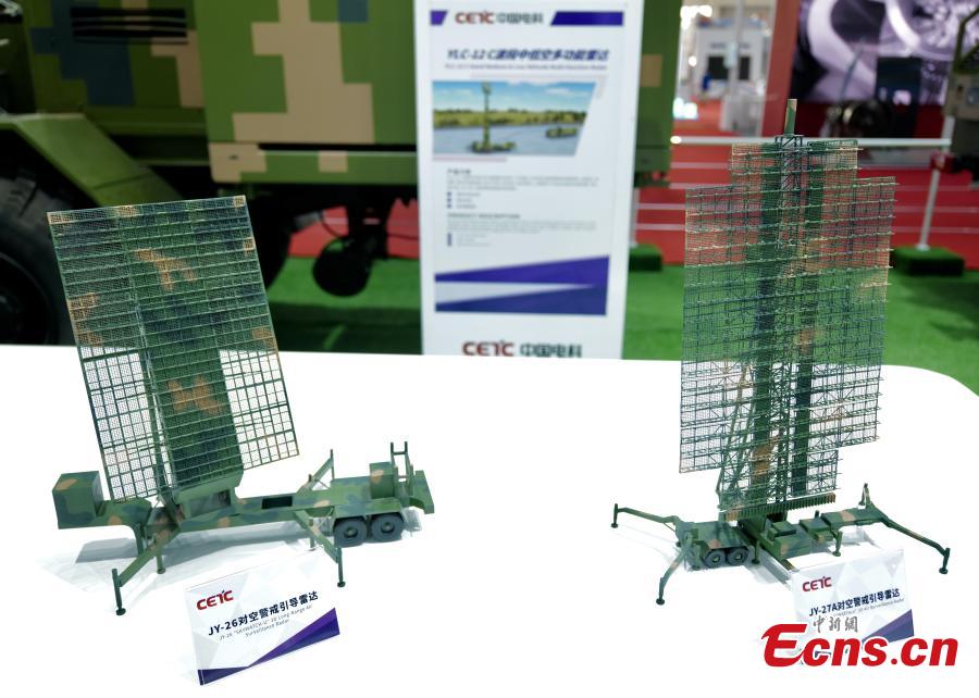 Models of China's long-range 3D warning radar JY-26 (Left) and JY-27 (Right) are showcased during the 13th China International Aviation and Aerospace Exhibition in the southern Chinese city of Zhuhai, Guangdong Province, Sept. 29, 2021. (China News Service/Chen Wen)