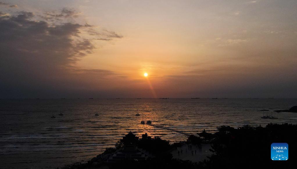 Aerial photo taken on Oct. 1, 2021 shows sunrise by the sea in Beidaihe District of Qinhuangdao, north China's Hebei Province. (Xinhua/Jin Haoyuan)