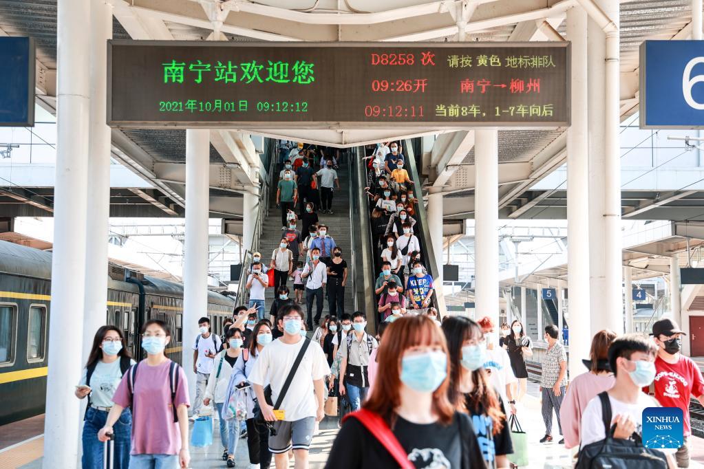 Passengers are seen at the Nanning Railway Station in Nanning, south China's Guangxi Zhuang Autonomous Region, Oct. 1, 2021. (Photo by Zhao Shilin/Xinhua)