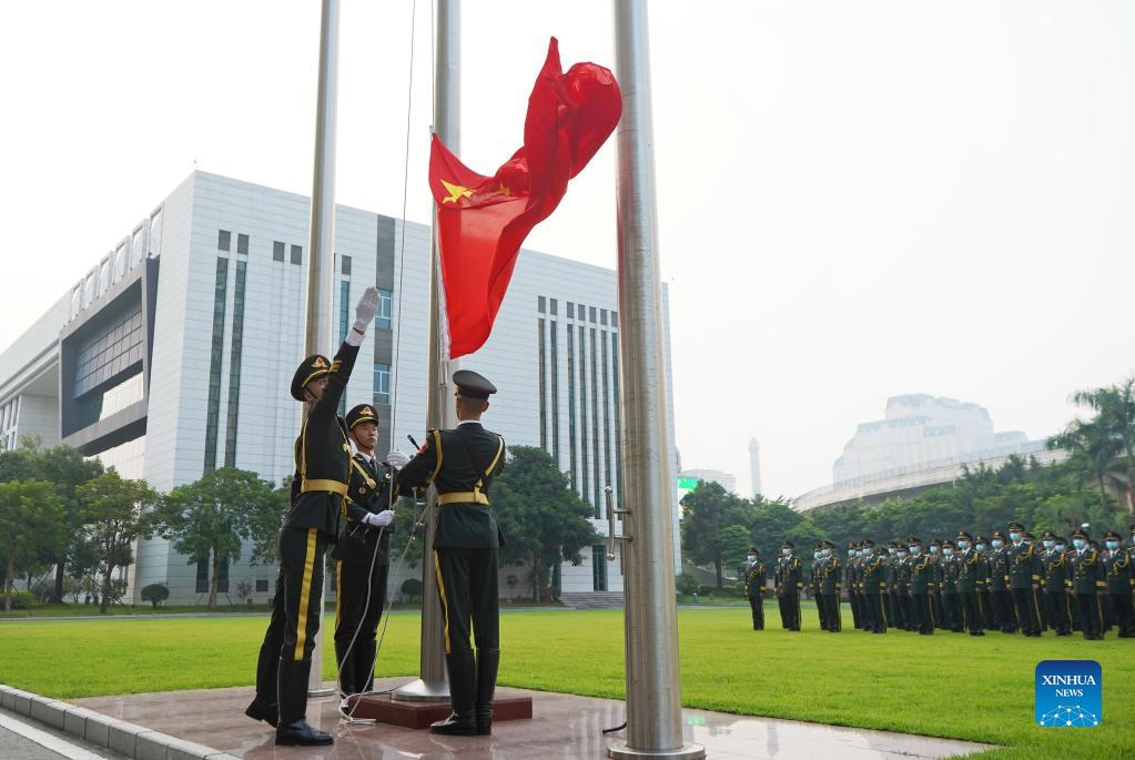 The Chinese People's Liberation Army (PLA) Garrison in the Macao Special Administrative Region holds a flag-raising ceremony to celebrate the 72nd anniversary of the founding of the People's Republic of China in Macao, south China, Oct. 1, 2021. (Photo by Zhang Kairong/Xinhua)