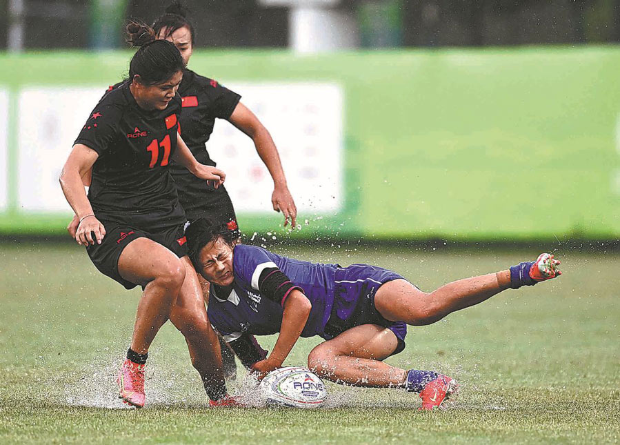 A Jiangsu player (blue) vies for possession with two united team rivals during the women's rugby sevens final on Sept 19. The United team won 32-0. WEI XIAOHAO/CHINA DAILY
